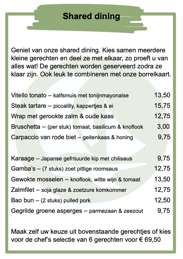 Geniet van onze shard dining. Kies samen meerdere kleine gerechten en deel ze met elkaar. Zo proeft u van alles wat! De gerechten worden geserveerd zodra ze klaar zijn. Ook leuk te combineren met onze borrelkaart.